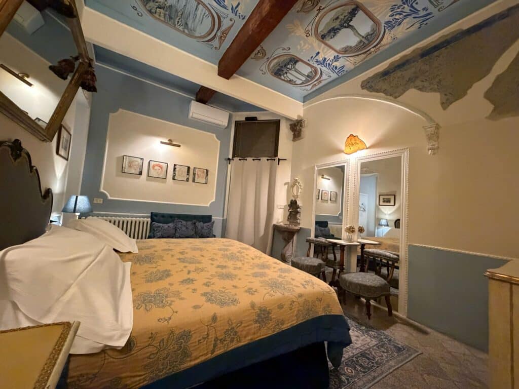 Let’s start with the “Golden Suite” on the first floor of my historic building in the heart of Florence, consisting of two adjacent spacious double rooms, ideal for a couple, a family, or a small group. And then there is the so-called “Terrace Suite“, which consists of two bedrooms with wonderful frescoes, high ceilings, and a fabulous rooftop terrace where you can rest and enjoy an outdoor space. It has two small bathrooms and there is the possibility of a third larger bathroom if required. And last but not least there is a space on this floor called “La Cantante“, a beautiful double room with a private bathroom and a view of the neighborhood gardens. It is also available as double room for single use.
